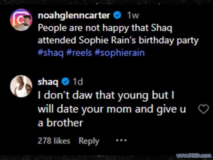 奥尼尔在八卦新闻下回复道:"我不会约会那么年轻的,但我会和你妈约会然后给你(八卦新闻记者)添个弟弟。"(如图上)