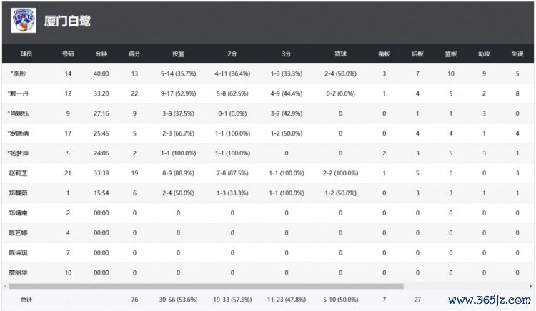 球队方面,全队整体三分回暖,全队远投23投11中,投出47.8%的三分命中率。并且在攻击 端打得十分合理,多次打出内传内和反击协作 ,全队共有19次助功 。球员方面,李彤拿到13分10篮板球 9助功 的准三项数据上双数据,作为中轴策应点,她很好地梳理了球队的攻击 ;赖一丹17投9中,其中三分9中4,拿到全队最高的22分,多次在胶着时刻拿分帮助球队稳住局面;赵莉芝本场赛事 多次篮下吃饼成功,以9投8中的超高命中率砍下19分;另外肖婉珏、罗晓倩和郑馨茹等人也打出非常不错的效率。