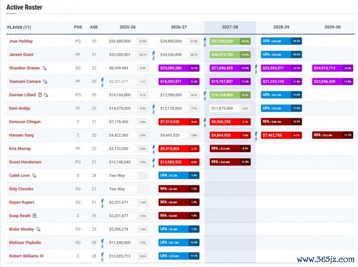 随着夏普和卡马拉两人的续约, 超级体育风云开拓者未来阵形 已趋于稳定, 足球快讯名单上有8名球员手握至少3年合同:利拉德、霍勒迪、夏普、卡马拉、阿夫迪亚、格兰特、克林根、杨瀚森。