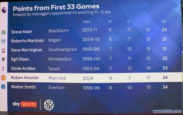 9月30日讯 天空体育对在英超俱乐部上任后,前33轮英超积分最低的主帅进行了统计, 超级体育风云直播吧曼联主帅阿莫林排在第6。