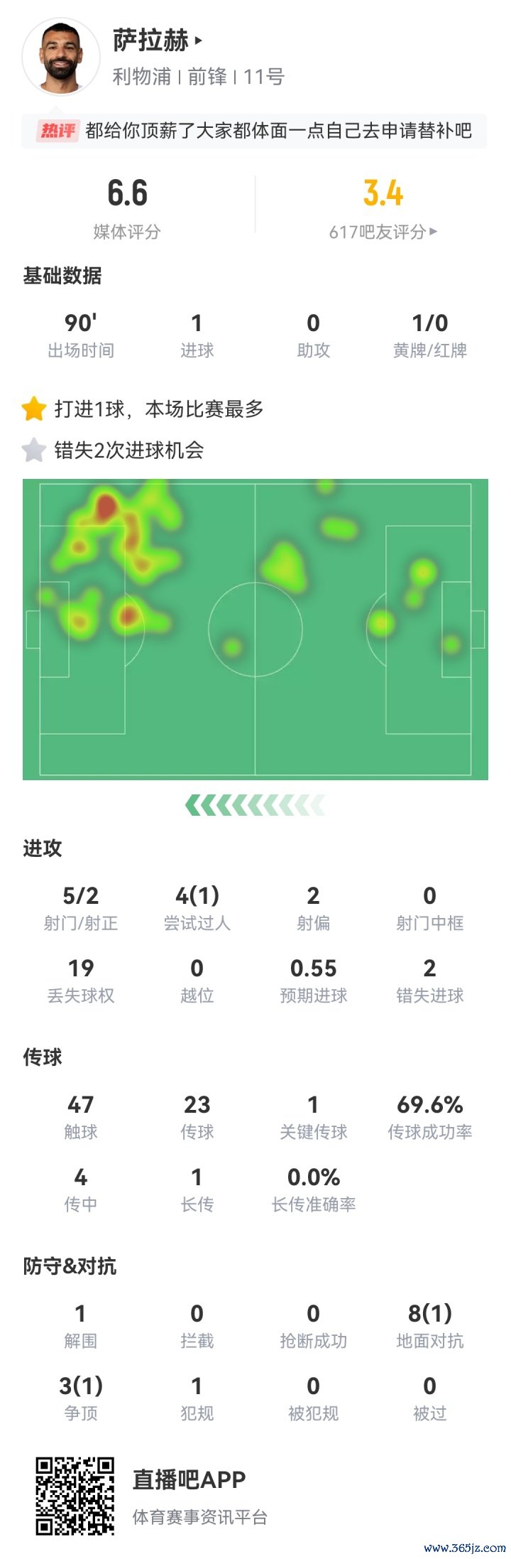 凌晨英超第9轮,利物浦2-3不敌布伦特福德。萨拉赫在比赛最后时刻打入一球, 足球快讯英超直播但他今天的表现依然不能让球迷满意,拜仁慕尼黑给他打出了3.4分的低分。