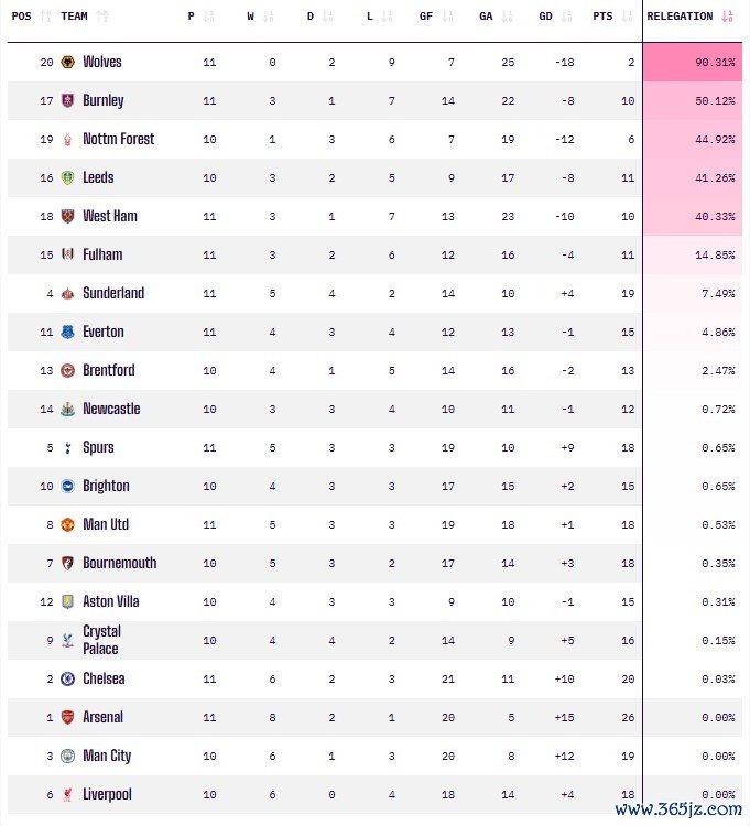 超级体育风云体育直播狼队的降级概率已高达90.31%,