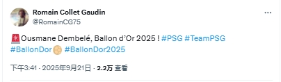 该记者表示:“奥斯曼-登贝莱,2025年金球奖得主!”这位记者供职于多家法国正规媒体, 足球快讯英超直播有比较高的可靠度。