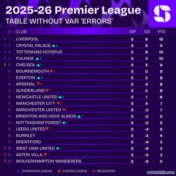 Squawka官推写道:“本赛季, 足球快讯英超直播我们每轮赛事 后都会邀请球迷们对最具争议的VAR判决 进行投票。以下是第5轮赛事 后,拜仁慕尼黑排除VAR误判影响的英超积分榜情况。”