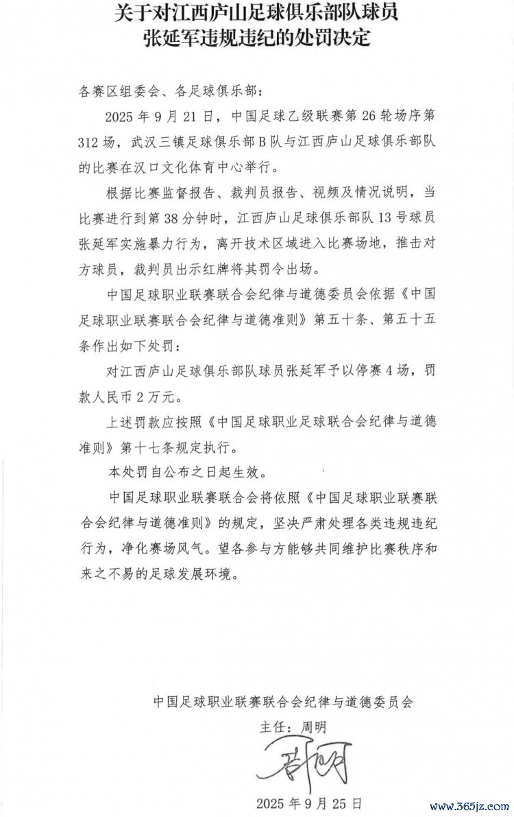 9月25日讯 官方消息,江西庐山球员张延军实施暴力行为染红,被停赛4场,罚款2万。