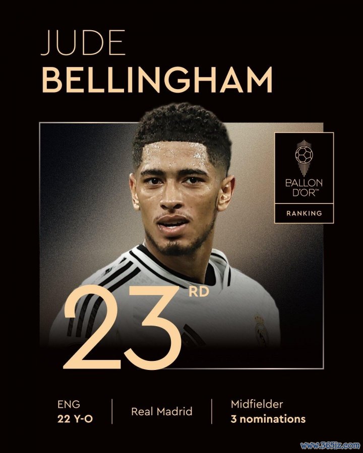 23、贝林厄姆(皇马/英格兰、22岁、第三次获得提名)