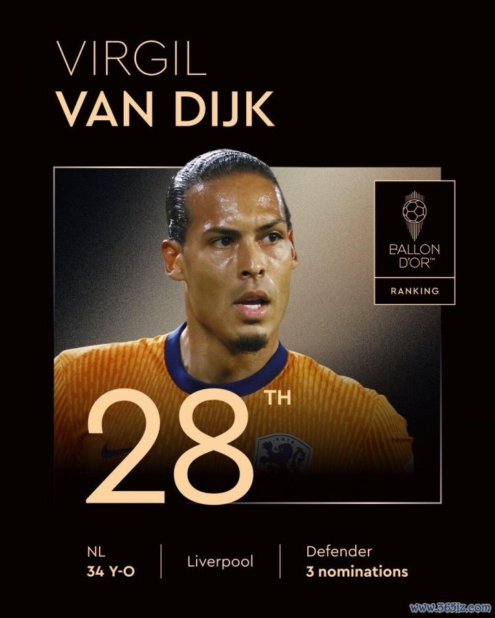 28、范迪克(利物浦/荷兰、34岁,第三次获得提名)