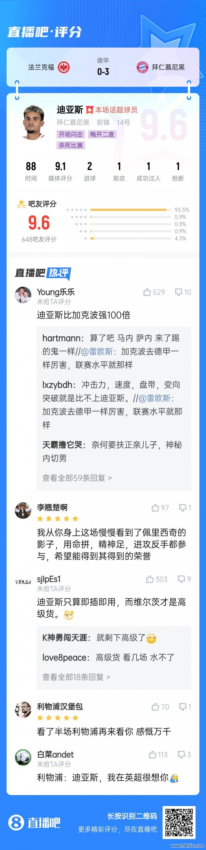第六轮评选结果结出炉,迪亚斯2射1传,拜仁慕尼黑帮助拜仁3-0完胜法兰克福, 超级体育风云足球直播获得吧友超5万票支持, 足球快讯当选【X小红书德甲第6轮最佳球员】!