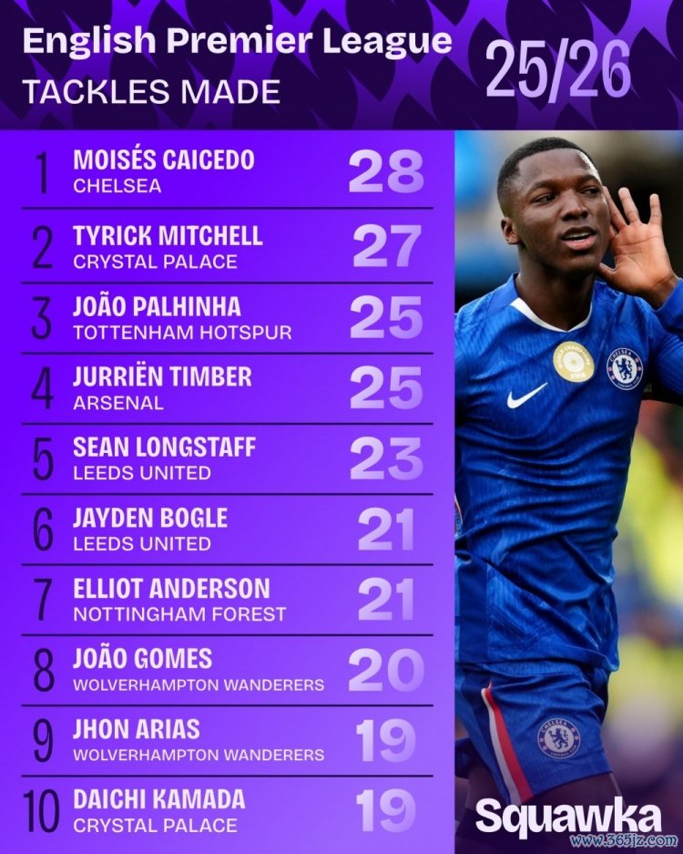 10月7日讯 Squawka统计了本赛季英超抄截 榜前十,切尔西中场球员凯塞多28次位居第一,